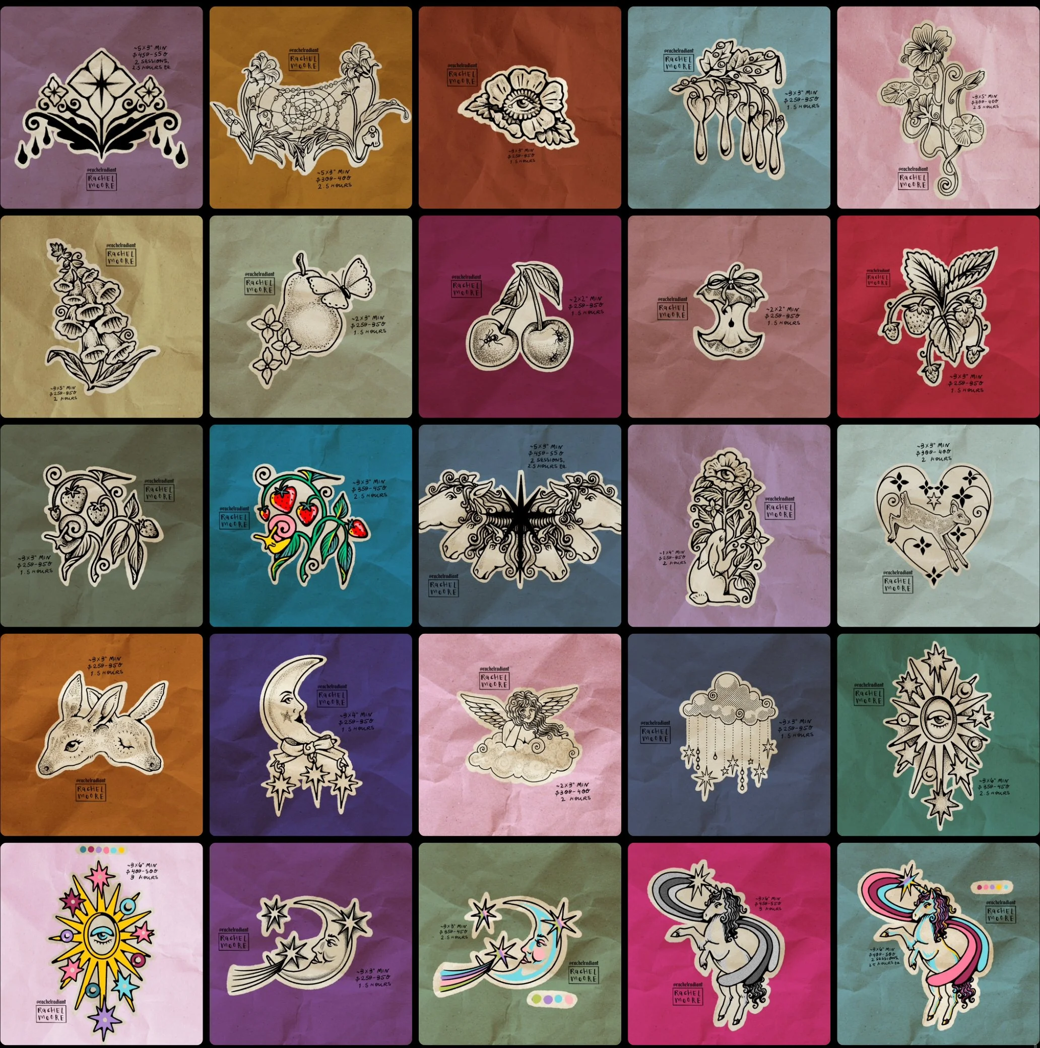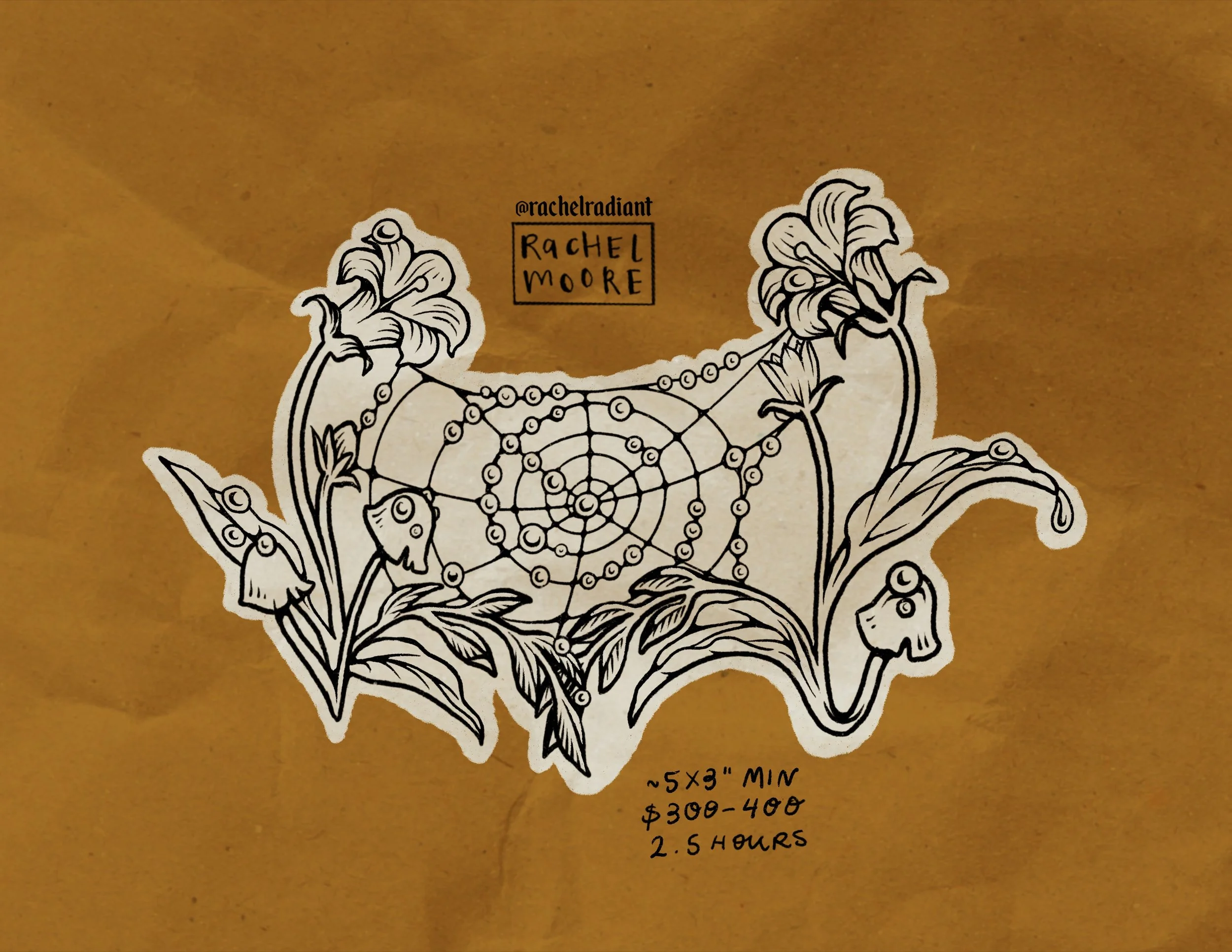 tattoo booking opportunities for this drop will be for december ‘25–february 2026 appointments. there will be no tattoo flash book openings this time around, i’m planning to retire some designs and make some changes to the book this winter. more info on that in the new year :)